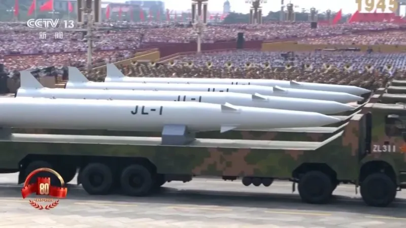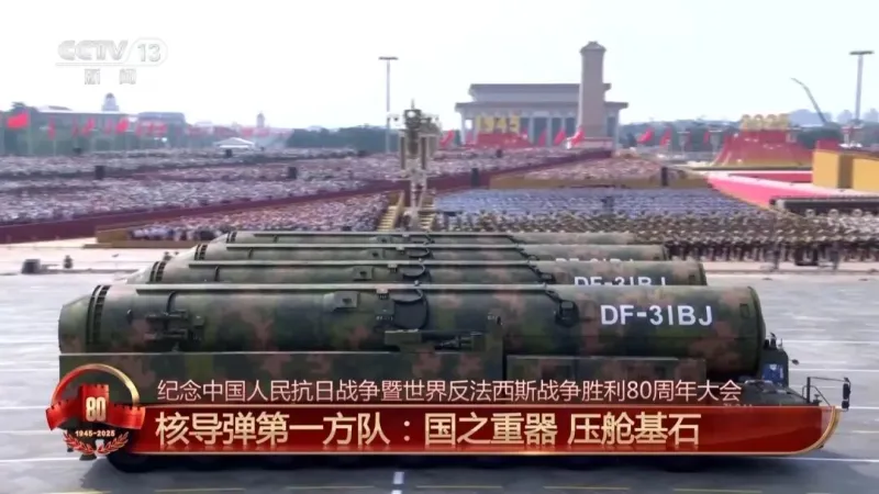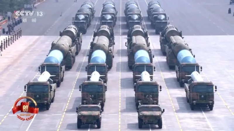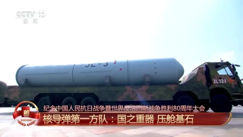 总台央视记者 王晓丹:高超声速导弹方队由多军种联合组成,在我身边的就是这次受阅的鹰击-21、东风-17、东风-26D导弹,都是高超声速导弹武器家族的重要力量,集中展现了我军高超声速精确打击能力。