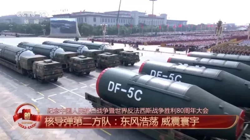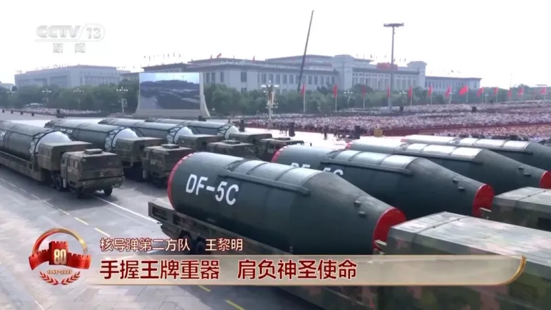 最后一个出场的方队,是由12台受阅装备车搭载着4枚东风-5C液体洲际战略核导弹组成的核导弹第二方队,东风浩荡、雷霆万钧,展现了大国重器的威武雄姿。
